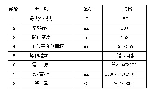 3:機械安全部分工作臺經(jīng)過真空調(diào)質處理,表面電鍍處理長期使用不變形,不生銹。裝卸模具之設計簡單,方便,快捷。操作面可加裝紅外線安全裝置。雙手同步操作,急升保護裝置。